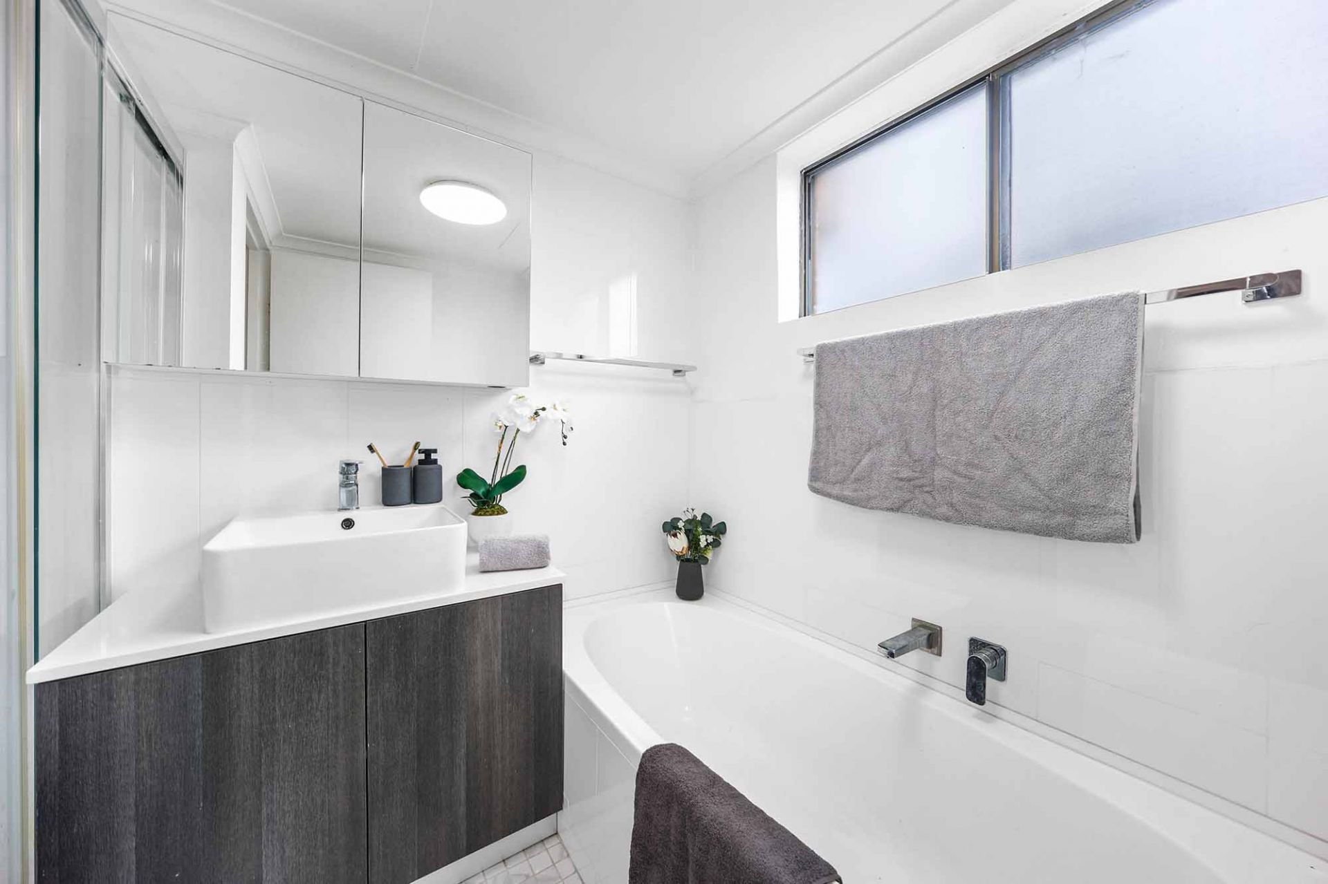 Modern vertical blinds, sleek timber floating boards throughout, and a split system air conditioner ensure year-round comfort and style.