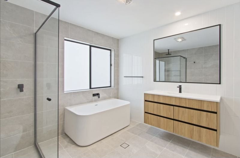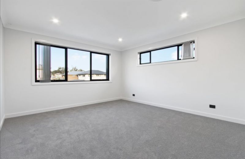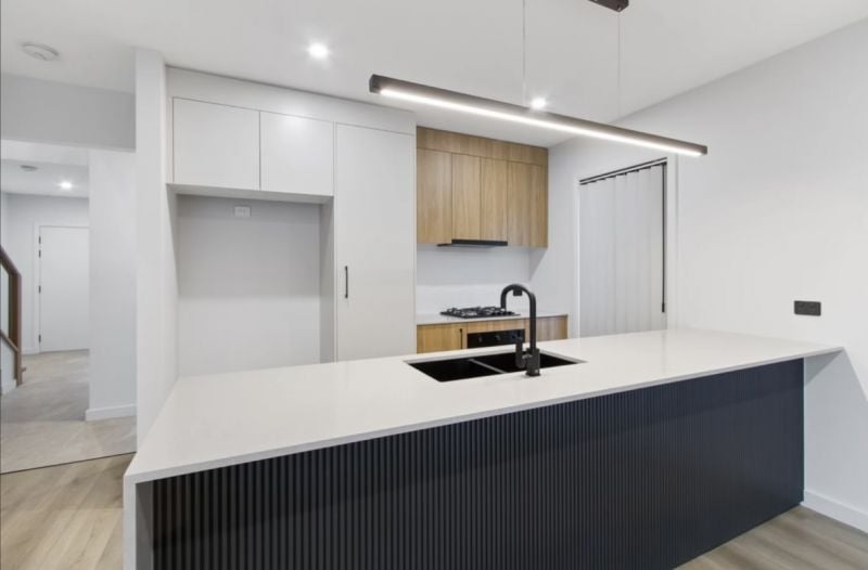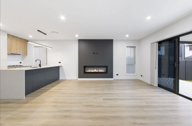 The master bedroom serves as a private retreat, complete with a walk-in robe and a stylish ensuite, offering the perfect place to unwind. The modern kitchen is a chef’s dream, featuring unique timber finishes, a striking stone benchtop, and a spacious breakfast bar, perfect for casual dining or entertaining guests. The open-plan design creates a seamless flow between the family and dining areas, allowing natural light to flood the home and creating a bright, welcoming atmosphere.