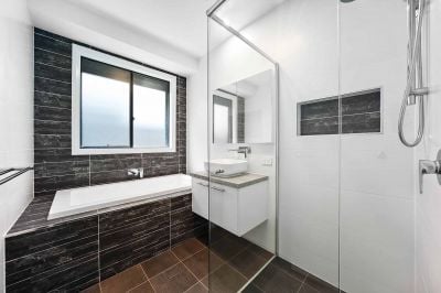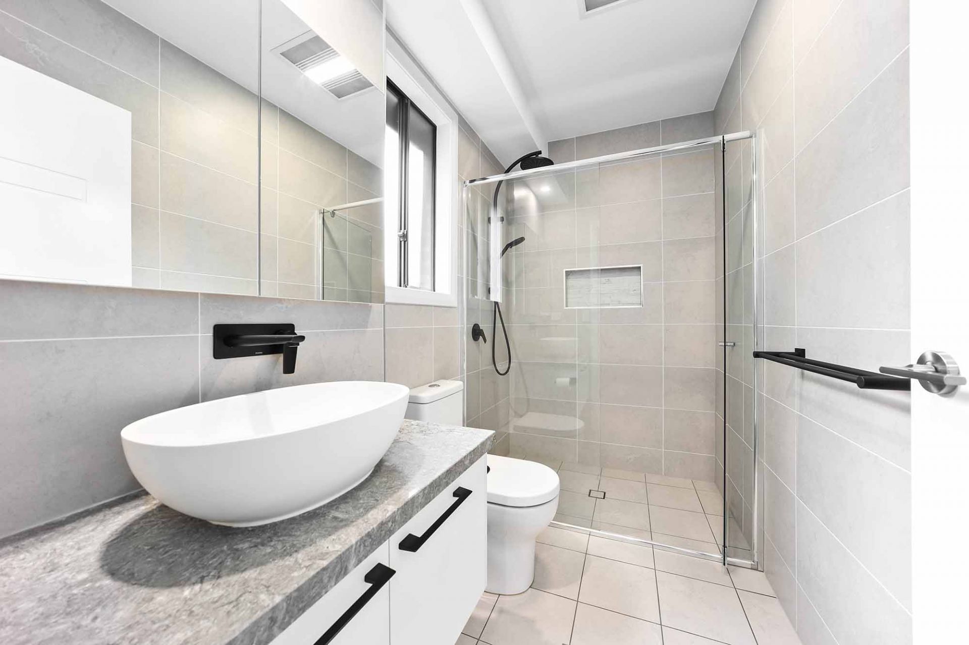 The modern main bathroom boasts a separate toilet, providing both privacy and practicality.