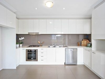 - Large modern kitchen with dishwasher and stainless-steel gas cooking appliances
